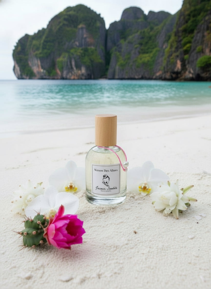 Cette eau de parfum de composition vous plaira je l’espère. Laissez-vous transporter par la brise estivale d’un jasmin tropical entremêlé de noix de coco lactée. Des notes solaires vous dévoilent l’ébauche d’une île paradisiaque perdue et permettent une sillage d’amour qui dure à l’éternel..