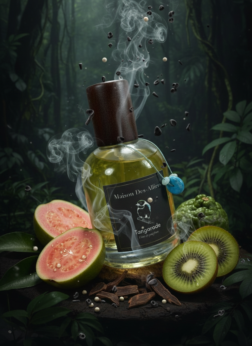 Ici vient se déployer complètement l’image de la marque. Le Tangara Septicolore d’Amazonie est une espèce au plumage haut en couleur et difficile à apercevoir en milieu naturel. Le signe d’air qu’il représente ainsi que l’exotisme et la liberté m’ont poussé à le placer au centre de la marque. Cette création vous plongera dans le terroir humide des forêts d’Amazonie et dans un sentiment de renaissance d’une terre vierge. Tangarade est un minutieux travail d’assemblage entre plusieurs notes de fruits vert aqueux tropicaux, de fines épices et surtout de bois de Oud Cambodgien rare apportant des notes complexes et une profondeur unique. Ne ratez pas votre avion!